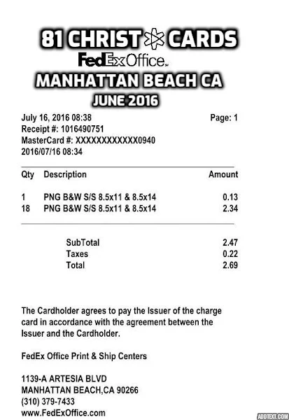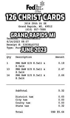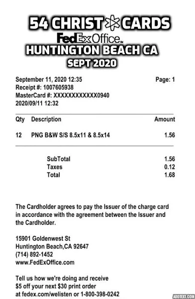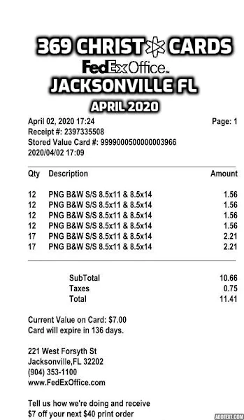 "Street Evangelism” is also another way I try to reach people & plant seeds for Christ. Many years ago, I created a card that is saved on a flash drive, & which I can print -on-demand at copy shops across the USA (usually Fed Ex Office, but also Staples, & sometimes libraries, etc). Here are some of the receipts from printing those cards. Each page holds NINE tracts which I call “Christ Cards” , which I print on card stock, making them a little more durable than mere paper, & which usually are easily inserted under windshield wipers or on the driver’s side window. I recently tabulated how many copies I’ve made over the years to count the number of Christ Cards I’ve distributed. Here’s the images from those receipts to 2 which I’ve added some text for easier reading. The total Christ Cards based on the receipts I found = 8545 total, if I did the math right. My personal tracts emphasize the importance of repentance, baptism, & accepting Christ. I’ve also recently begun distributing some kindness tracts. So on top of the verified 8545 shown here, I estimate a few 1000 more from other copy shops where I didn’t save receipts (Fed Ex Office is handy because I got the receipt in my email box, making it easy to retrieve & print) for a probable grand total of 10,000 seeds ! glory to God, not me.